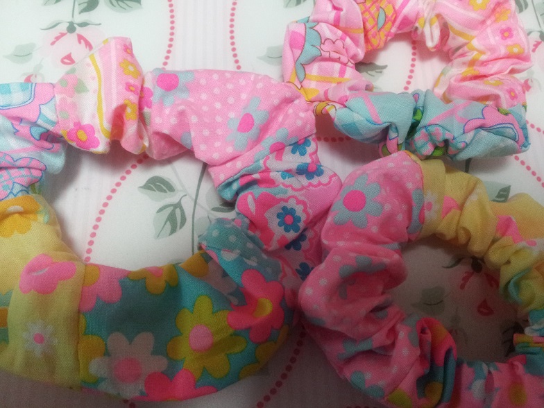 pinksさんの生地でパッチワークしてシュシュを作る┌( ಠ_ಠ)┘と思いついてとりあえず見よう見まねで作ってみた…