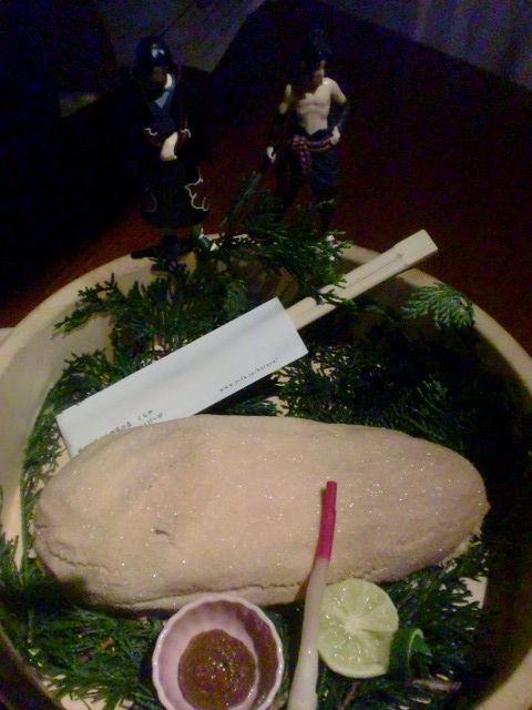 この一枚目の写真のなんかエロチックな気もする塊は固い岩を割るとそこには塩に包まれたホクホクの鯛が隠れているという激ウマ料理ですよー!!かなづちでガンガンしたら鯛が出てくるのですよー!ウマー!